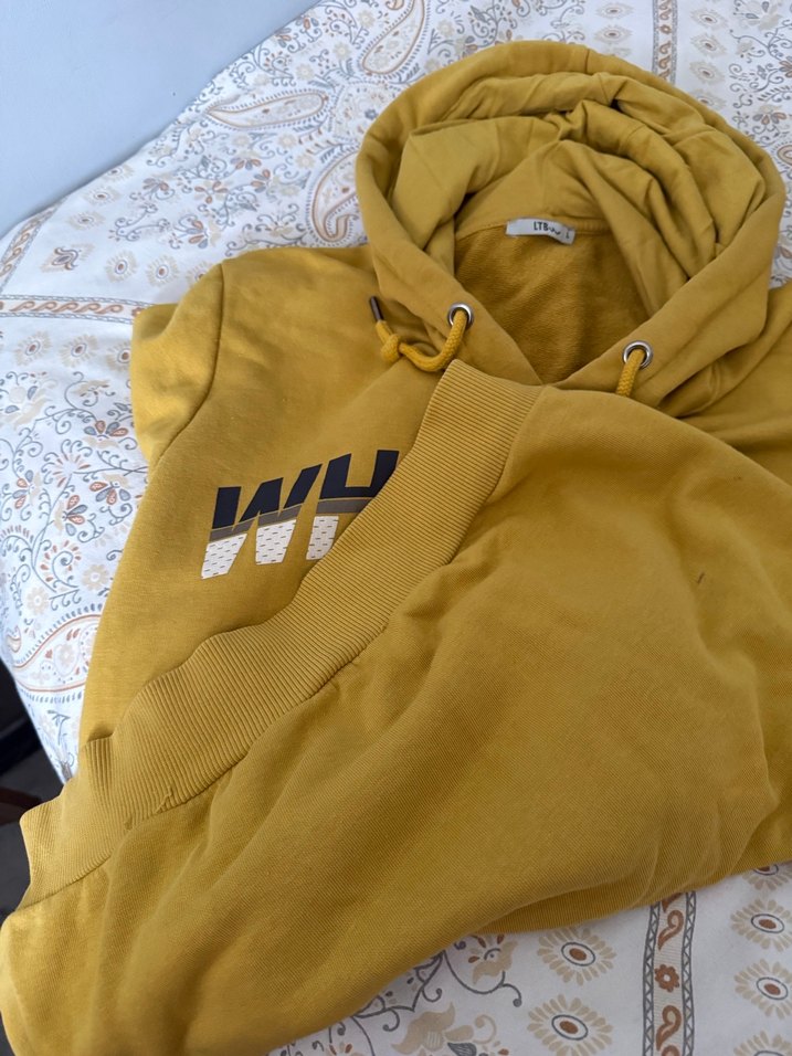 Sarı kapüşonlu, bol kesim uzun kollu kadın sweatshirtü. Yumuşak sentetik kumaştan, önü gri detaylı drapeli tasarıma sahip. Günlük ve sokak stiline uygun.