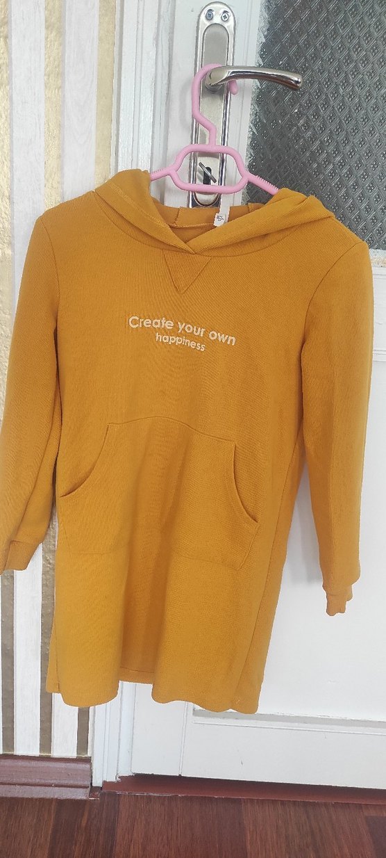 Sarı, parlak renkte, uzun kollu ve yuvarlak yakalı, örgü dokulu bol kesim kadın sweatshirtü. Önünde 'Create your own happiness' yazılı baskı ve cep bulunur.