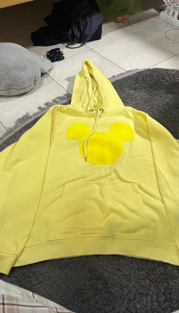 Rahat kesim, uzun kollu sarı kapüşonlu sweatshirt. Önünde baskılı desen ve düğme detayı bulunur. Yumuşak, sıcak kumaştan üretilmiştir.