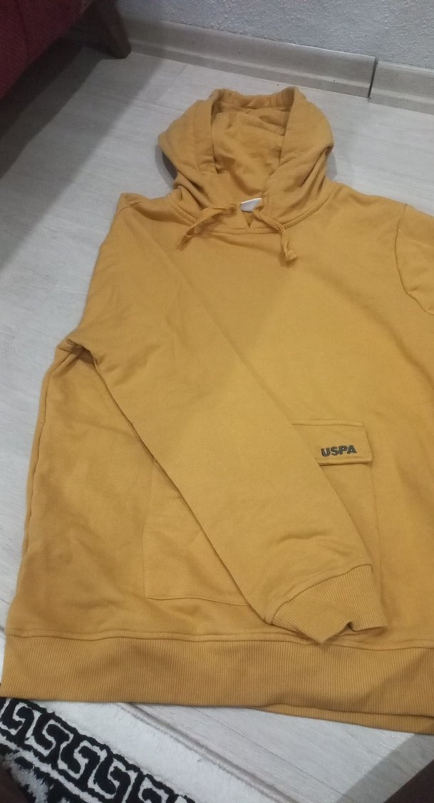 Sarı kapüşonlu sweatshirt, uzun kollu ve bol kesimdir. Yumuşak ve sıcak kumaştan yapılmıştır. Normal uzunlukta, önünde küçük USPA logolu cep bulunur. Rahat sokak stili için uygundur.