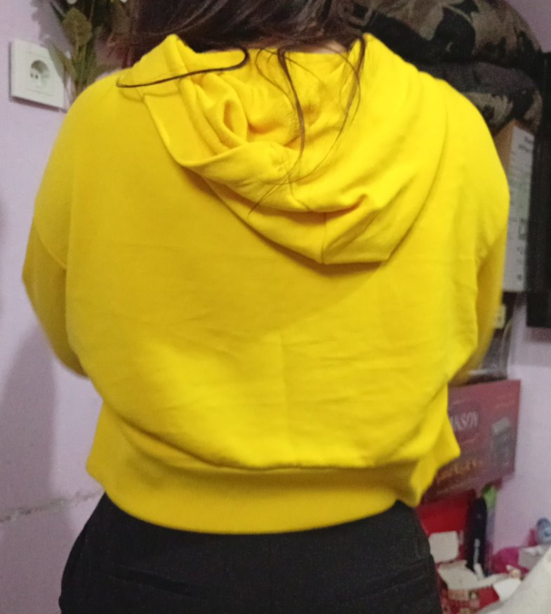Sarı renkte, kapüşonlu ve düğmeli kadın sweatshirtü. Rahat kesimli, uzun kollu ve baskılı tasarıma sahip, yumuşak ve sıcak kumaştan üretilmiştir.