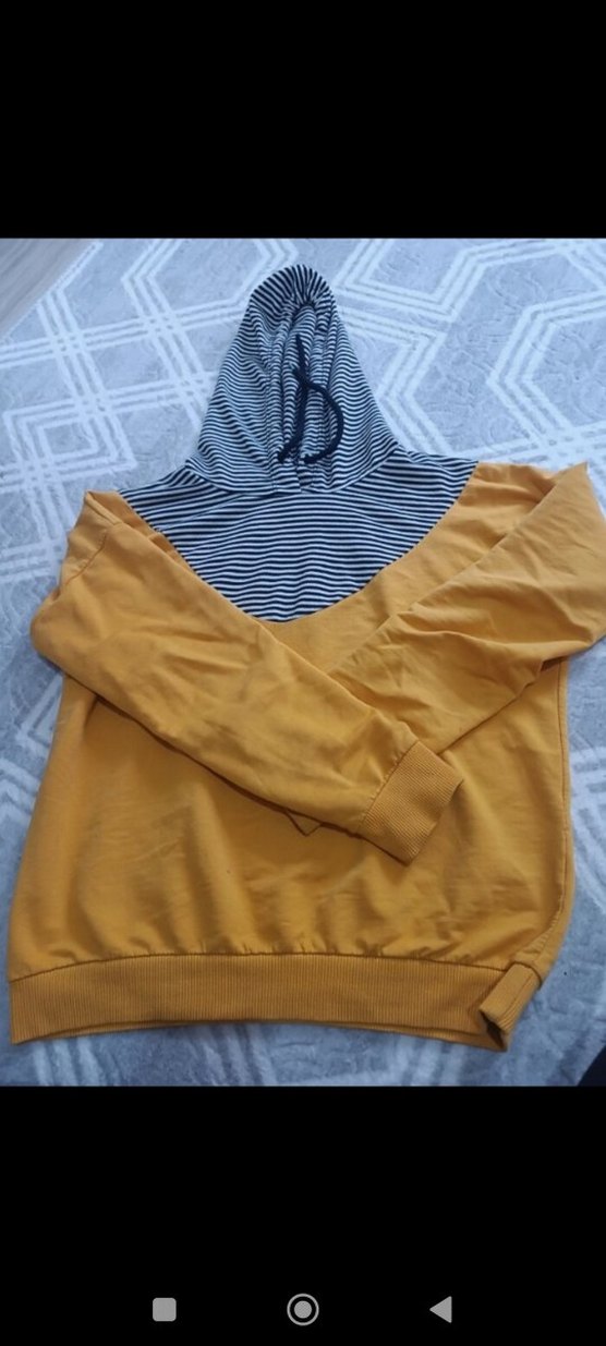 Uzun kollu, bisiklet yaka ve bol kesim kadın sweatshirtü. Sarı gövde ile gri-siyah çizgili örgü kapüşonlu, günlük kullanıma uygun rahat bir tasarım.