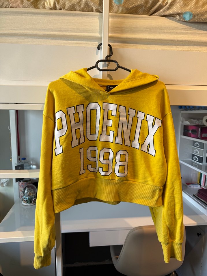 Degacto Sarı, kapüşonlu ve bol kesim uzun kollu sweatshirt. "PHOENIX 1998" baskılı, yumuşak örme kumaştan, spor ve günlük kullanıma uygun.