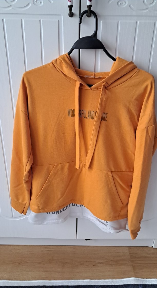 Sarı renkli, uzun kollu, kapüşonlu ve baskılı kadın sweatshirt. Rahat kesimi ve yuvarlak yaka detayıyla günlük kullanıma uygundur.