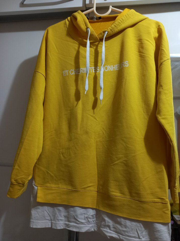 Sarı kapüşonlu kadın sweatshirt, bol kesim ve uzun kolludur. Parlak görünümlü, baskılı ve yumuşak dokuludur. Önünde 'ET CHERIR TES BONHEURS' baskısı bulunur.