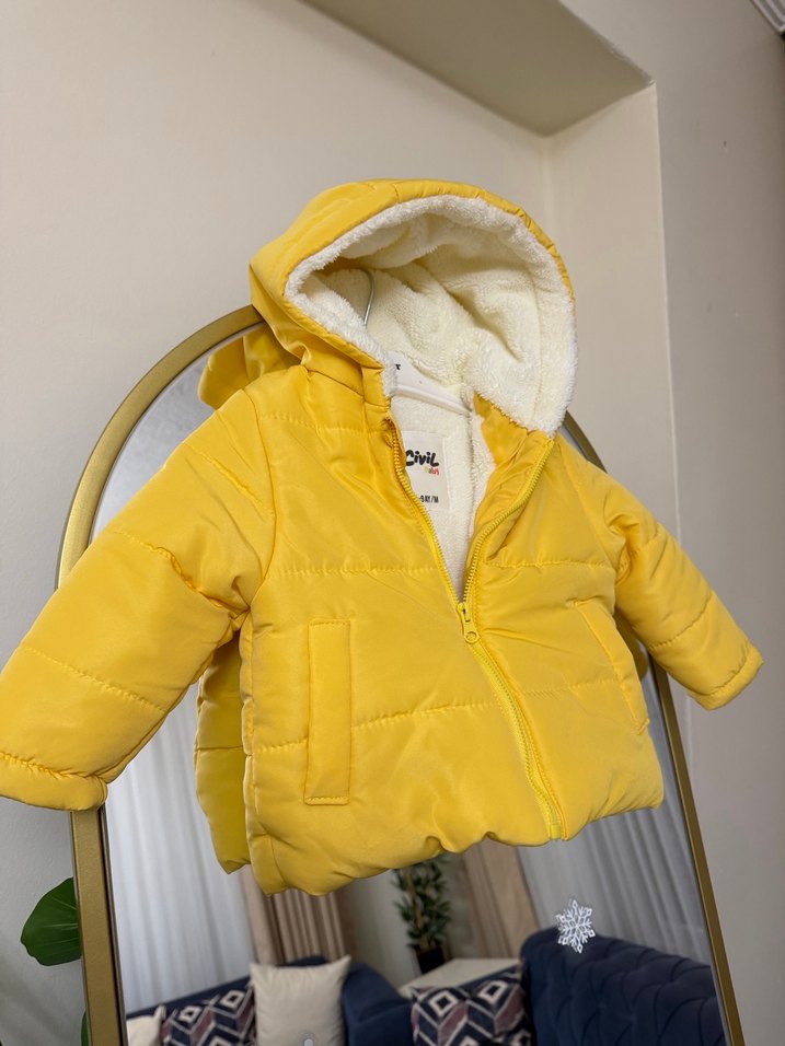 Ürün hediye geldi hiç kullanılmadı etiketi yok Sarı renkli, kapüşonlu ve kürklü detaylı erkek çocuk montu, sade ve renkli tasarımı ile sokak modasına uygundur.