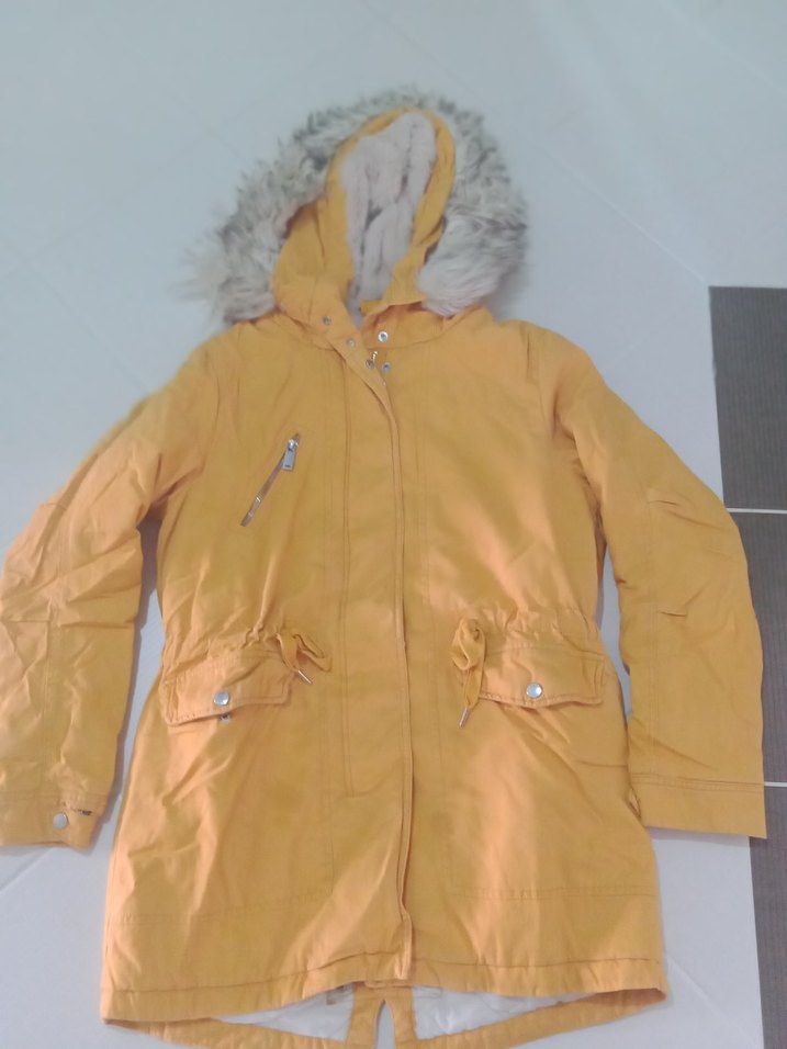 Bu sarı kapüşonlu kadın kışlık mont, kürk detaylı ve uzun kolludur. Yumuşak ve sıcak kumaştan, normal midi boyda, dış mekan için uygundur.