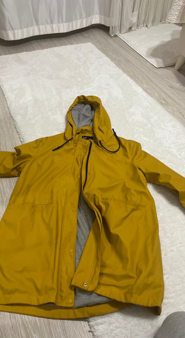 Sarı midi yağmurluk, yüksek yakalı ve uzun kolludur. Fermuarlı ön kapaması ve bol kesimi vardır. Yumuşak, sıcak kumaştan yapılmıştır ve sokak stiline uygundur. ️