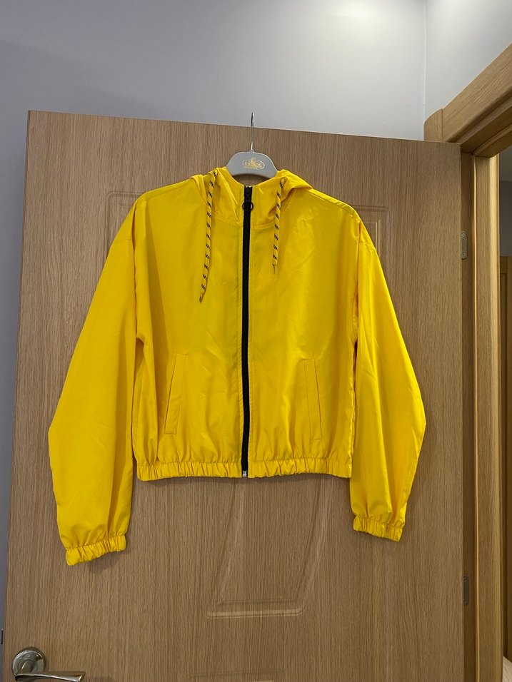 Parlak sarı renkte, kapüşonlu ve fermuarlı kısa uzun kollu ceket. Rahat kesimi ve sentetik kumaşıyla gündelik dış mekan kullanımı için uygundur.