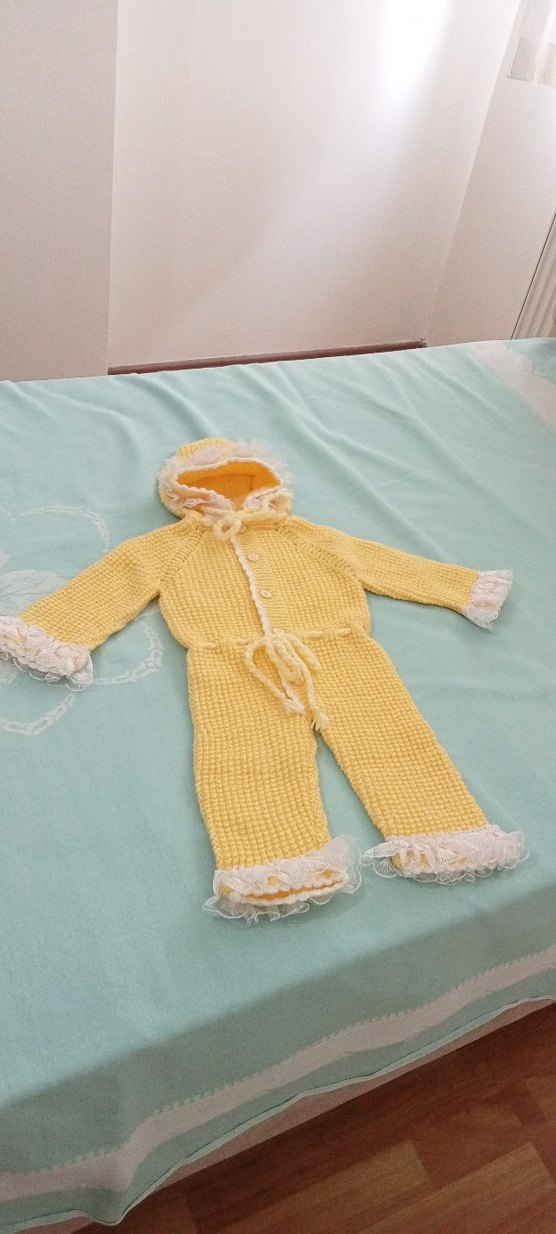 Sarı renkli, kapüşonlu örgü bebek kız tulumu. Kollar ve paçalarda beyaz dantel detayları bulunur. Yumuşak ve sıcak tutar. ❄️