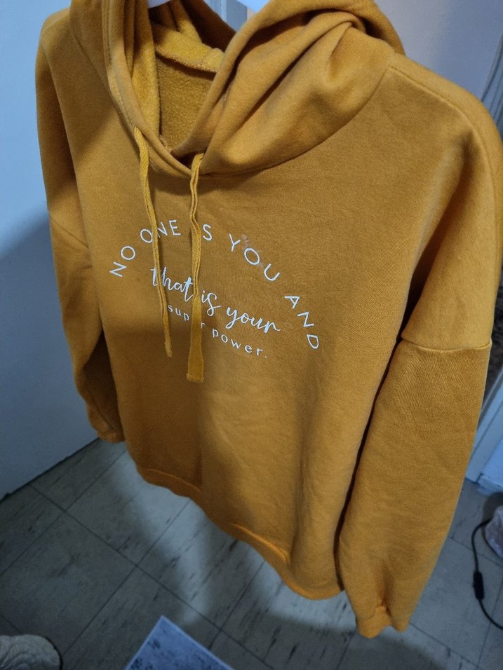 Sarı, uzun kollu, oversize kesim sweatshirt. Yumuşak kumaş ve baskılı motivasyon mesajı ile rahat sokak stili için uygundur.