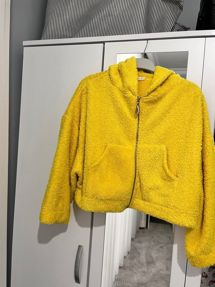Sarı renkli, kapüşonlu, kısa ve bol kesim kadın ceketi, yumuşak ve sıcak peluş kumaştan yapılmıştır. Uzun kollu ve kürk detaylıdır, rahat sokak stili için uygundur.