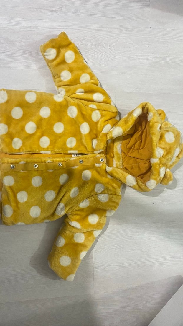 Renkli sarı kız çocuk ceketi, kapüşonlu ve düğmeli. Yumuşak, sıcak kumaştan yapılmış, puantiyeli ve dar kesim, günlük sokak stili için uygun.