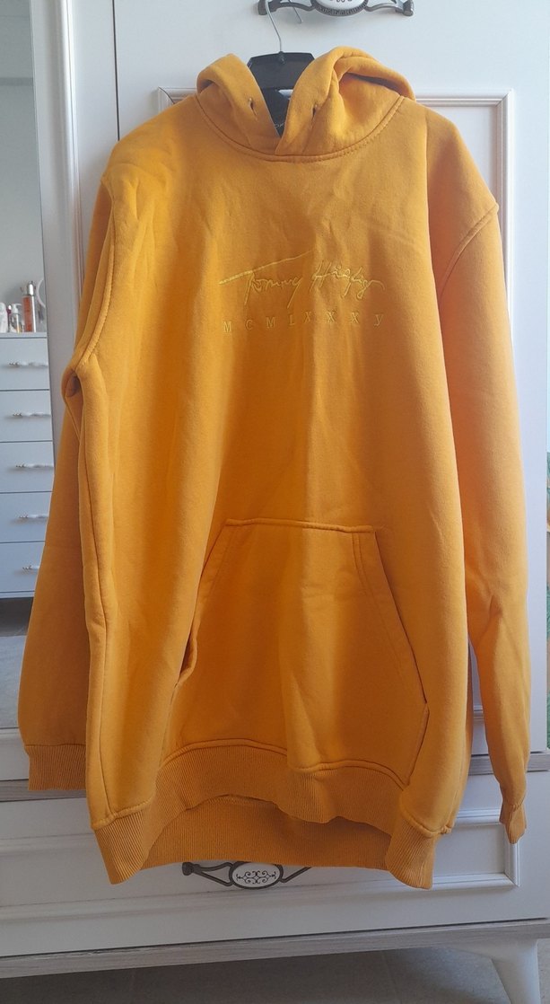 Sarı kapüşonlu sweatshirt, bol kesim ve midi boy uzunluğunda. Yumuşak ve sıcak kumaştan, günlük kullanıma uygun rahat ve şık bir parça. Parlak rengiyle enerjik bir görünüm sunar.