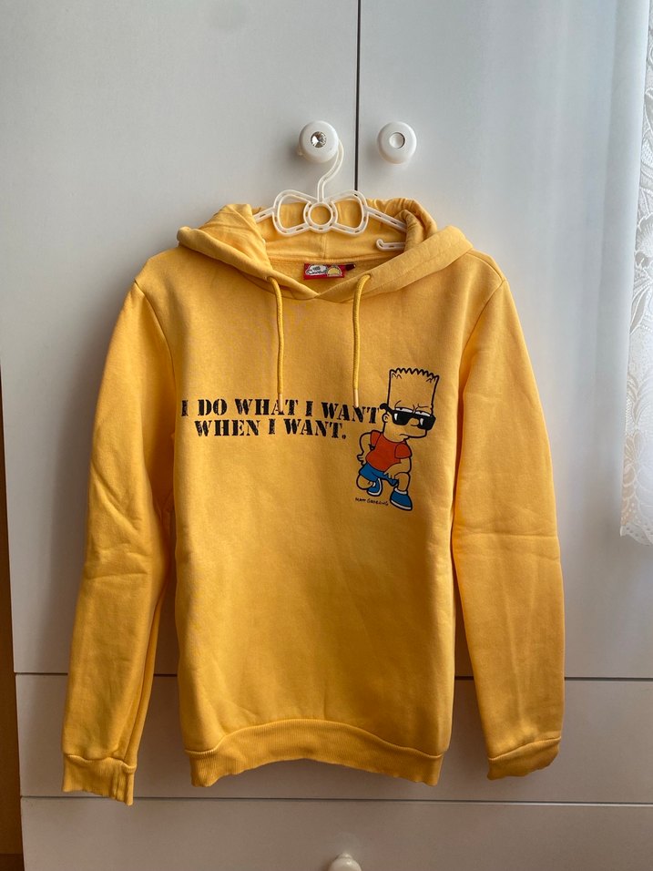 Sarı kapüşonlu sweatshirt, bol kesim ve uzun kolludur. Yumuşak kumaştan yapılmış, renkli baskılı ve "I DO WHAT I WANT WHEN I WANT." yazısı bulunur.