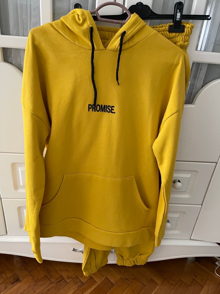 Sarı, bol kesim, kapüşonlu sweatshirt. Uzun kollu ve bisiklet yaka, üzerinde koyu renk "PROMISE." baskısı bulunur. Yumuşak ve sıcak kumaştan, günlük kullanıma uygun.