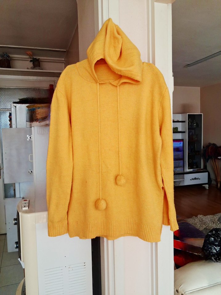 Yumuşak ve sıcak kumaştan, kapüşonlu, uzun kollu, midi boy, bol kesim sarı triko kazak. Günlük kullanıma uygun. Esnektir XXL beden dâhil uygundur