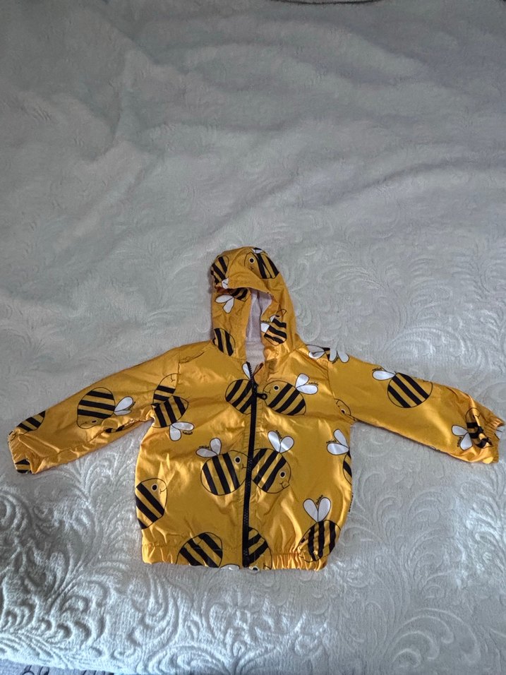 Parlak sarı sentetik kumaştan, kapüşonlu ve fermuarlı, arı desenli çocuk için yağmurluk.Marka temsili
