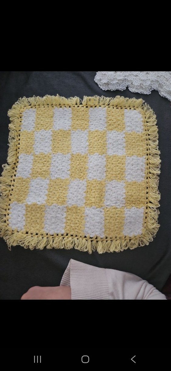 Sarı ve beyaz kare desenli, püsküllü kenarlı yumuşak dokulu banyo lifi