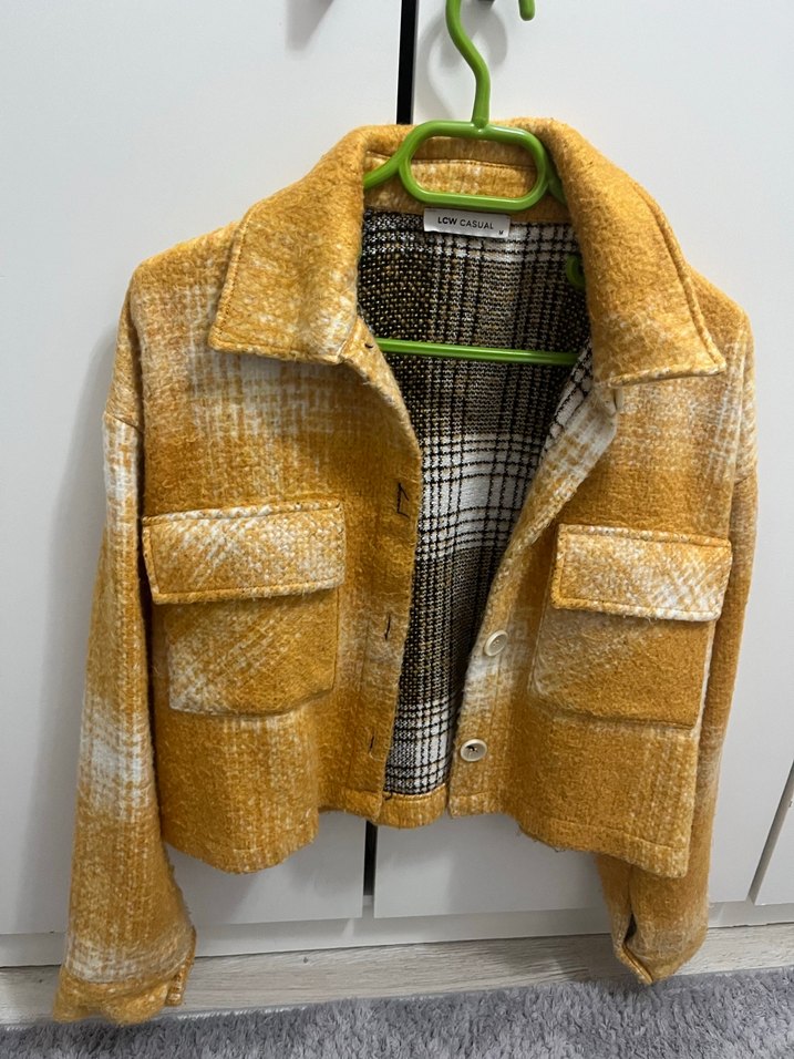 Sarı kareli, sentetik kumaştan, düğmeli, kısa ve bol kesim kadın ceketi. Uzun kollu ve çentikli yaka detaylı, günlük rahat kullanım için uygundur. Herhangi bir arızası yoktur. Çok az giyildi