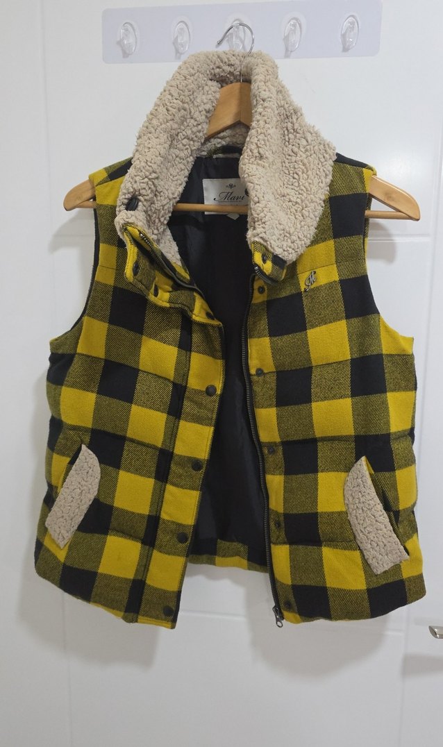 Sarı kareli, düğmeli ve yakalı kadın yelek, yumuşak ve sıcak fleece astarlı, rahat sokak stili için uygun kesimde.