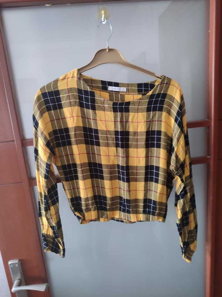 Sarı kareli kadın gömlek, uzun kollu, yuvarlak yaka ve düğmelidir. Normal midi boyda, bol kesim ve rahat tekstil kumaştan üretilmiştir. Günlük rahat stil için uygundur.