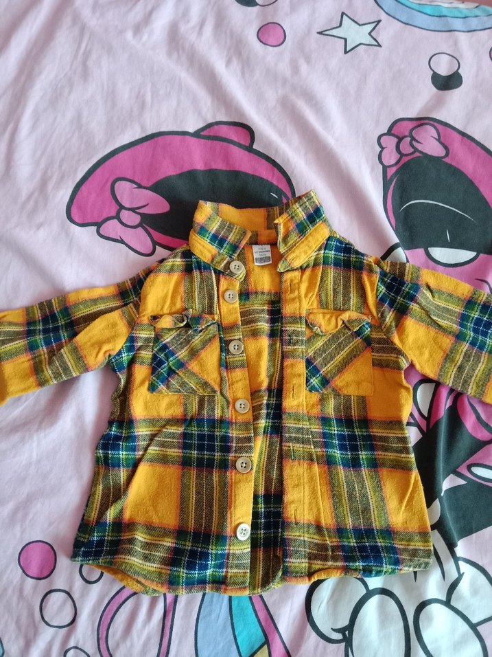 Sarı kareli desenli, uzun kollu ve düğmeli erkek gömleği. Sentetik kumaştan, salaş kesimli ve yakalı tasarıma sahip.