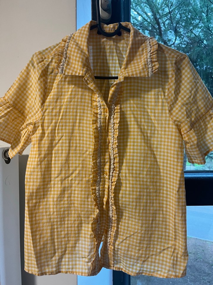 Nefes alabilen keten kumaştan, düğmeli ve yakalı, sarı kareli kısa kollu bol kesim bluz. Bohem sokak stili için uygun.