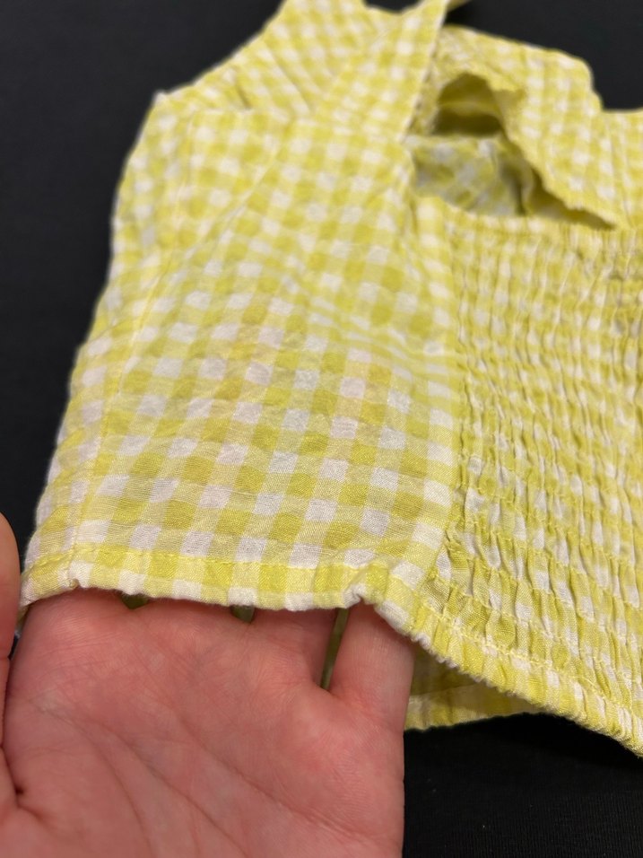 Pastel sarı kareli, V yakalı, kolsuz kız bluzu. Yumuşak keten kumaştan, pilili detaylı, bohem retro tarzda.
