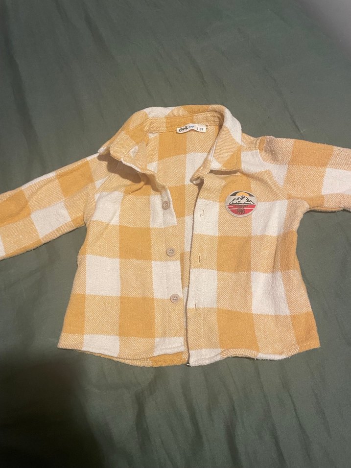 Düğmeli, uzun kollu, salaş kesim kız çocuk gömleği. Sarı pastel kareli desenli, yumuşak ve sıcak dokulu.