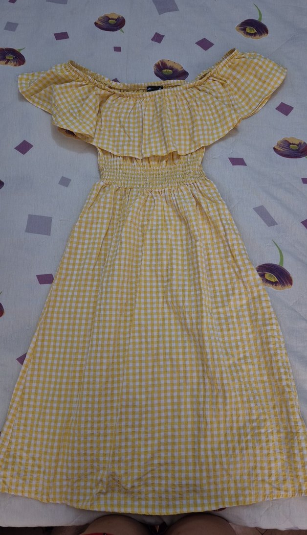 Sarı kareli midi elbise, fırfırlı kayık yaka, kolsuz ve bol kesimdir. Yumuşak sentetik kumaştan üretilmiştir.