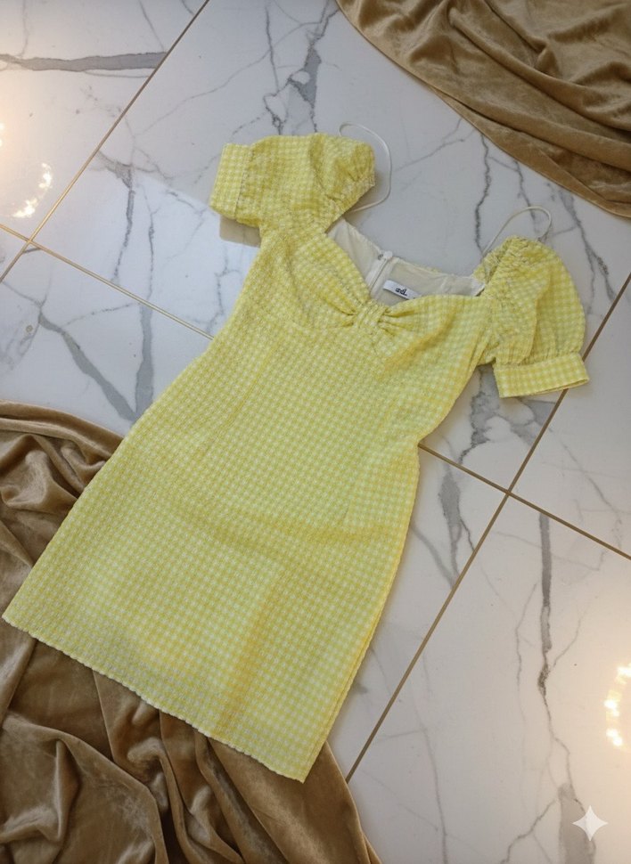 Sarı kareli midi elbise, kısa kollu ve V yakalıdır. Pastel tonlarda, vücuda oturan kesimi ve fırfır detaylarıyla günlük sokak stiline uygundur.