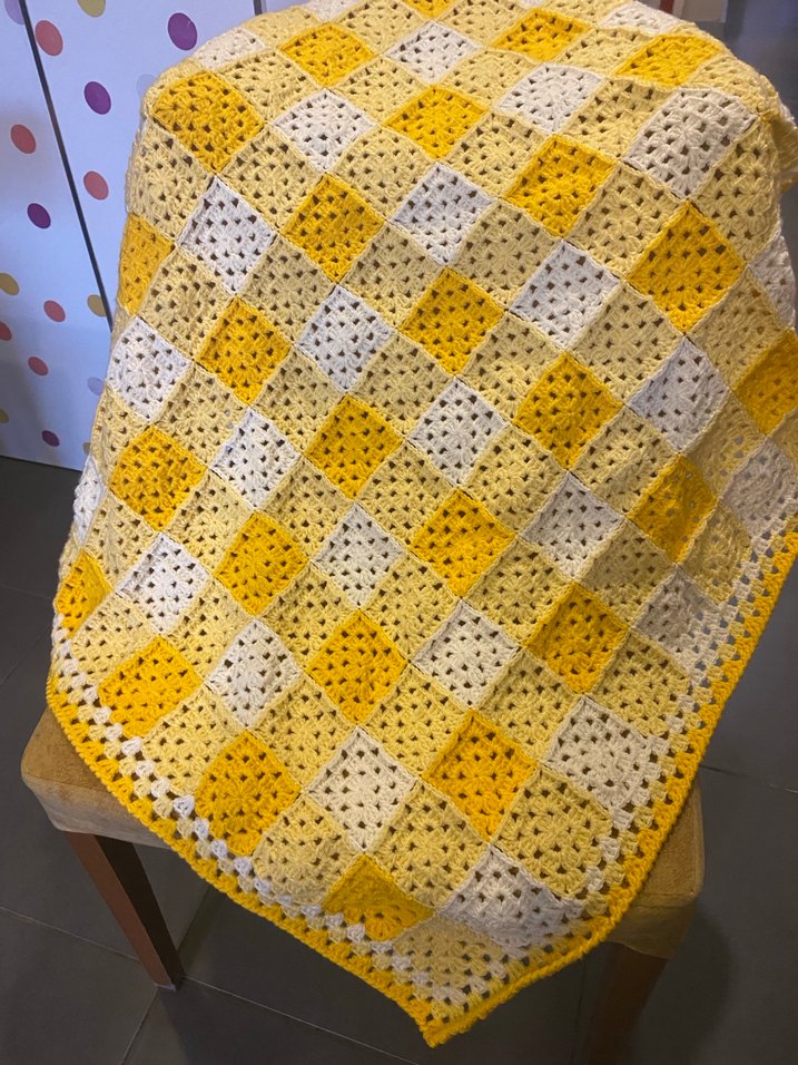 Yumuşak örgü kumaştan üretilmiş, açık sarı kareli desenli çocuk battaniyesi, sıcaklık ve konfor sağlar. El emeği
