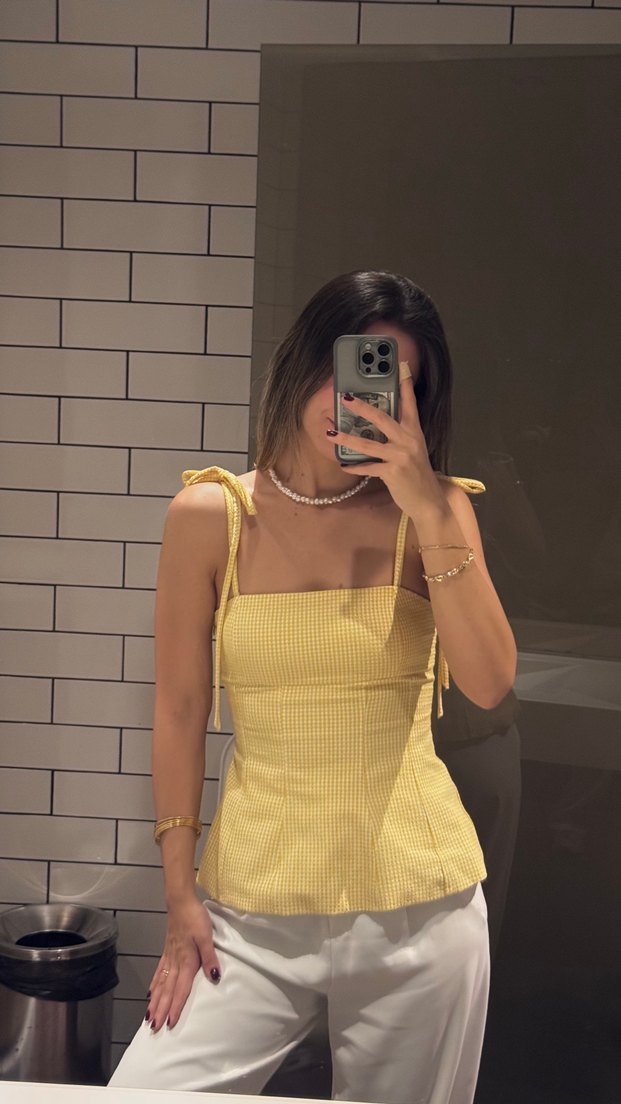 Sarı kareli, straplez yaka ve ince askılı, bele oturan midi bluz, rahat ve şık bir günlük sokak stili sunar. Pastel tonları ve sentetik kumaşıyla dikkat çeker.