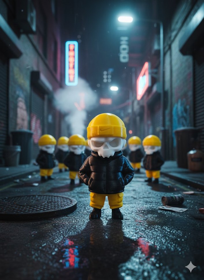 Sarı kask ve pantolon giymiş, siyah ceketli ve kafasında kafatası maskesi olan renkli aksiyon figürü. ♂️