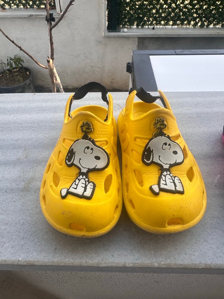 Sarı kauçuk malzemeden, bantlı ve Snoopy desenli erkek çocuk terliği, günlük sokak stili için uygundur.