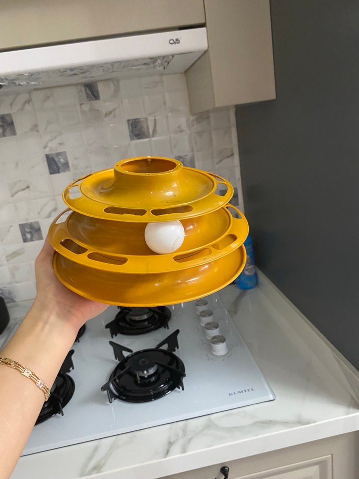 Sarı renkte, top içeren çok katmanlı kedi oyuncağı. Kedilerin oyun oynaması için tasarlanmıştır. Pazarlığa açığım