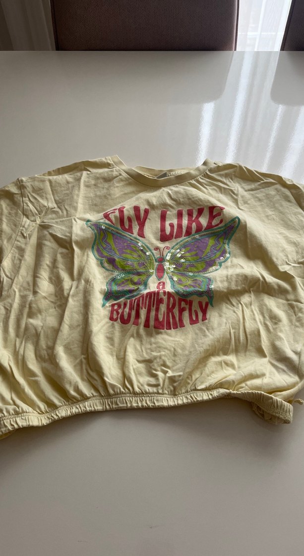 Sarı keten kumaştan, bol kesim kız gömleği. Uzun kollu, yuvarlak yaka ve etek kısmında fırfır detaylı. Önünde renkli kelebek ve 'Fly Like Butterfly' baskısı var.
