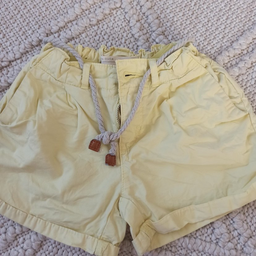Sarı kumaştan yapılmış, kemerli ve bol kesim kız şort, bohem tarzıyla rahat ve retro bir görünüm sunar.