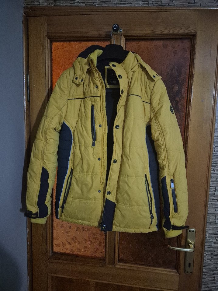 Fitted kesim, kemerli ve notched lapel yakalı erkek midi monttur. Yumuşak ve sıcak kumaştan, koyu sarı renkte, uzun kolludur.
