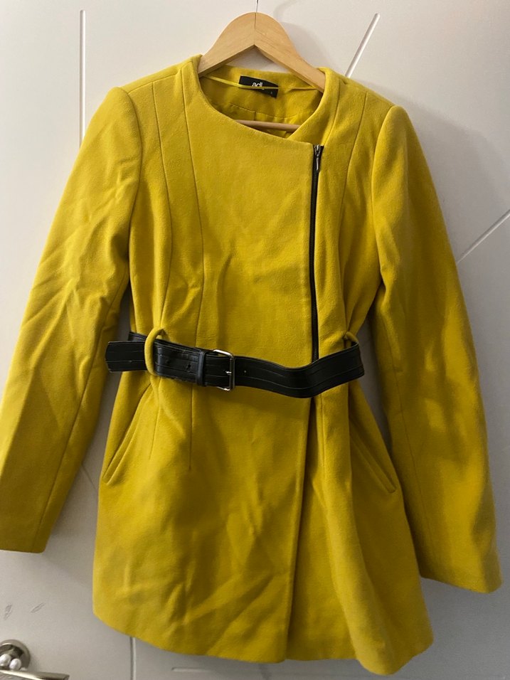 Kadınlar için parlak sarı renkte, yan fermuarlı ve bel kısmında siyah kemerli uzun kollu yumuşak dokulu kaban. Ürün giymediğim için hurçlayıp kaldırdım, kırışmış ama ütüleyip yollayacağım ve kuru temizleme yapılmıştır (renk yağ yeşilidir)