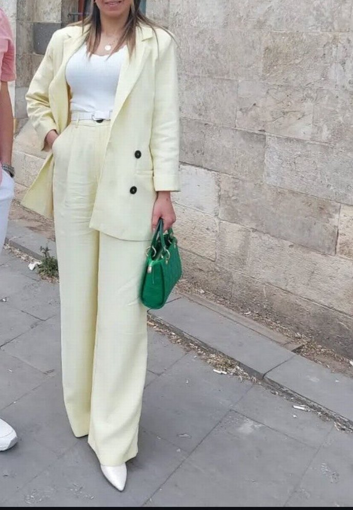 Kadınlar için sarı keten kumaştan kemerli, normal boy midi uzunluğunda, regüler kesim ceket ve pantolondan oluşan takım elbise. İş ve günlük şıklığı bir arada sunar.
