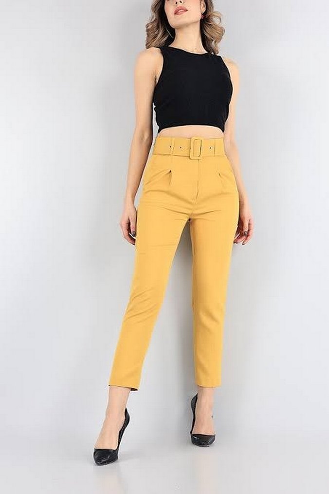 Sarı Kemerli Kumaş Kadın Pantolon