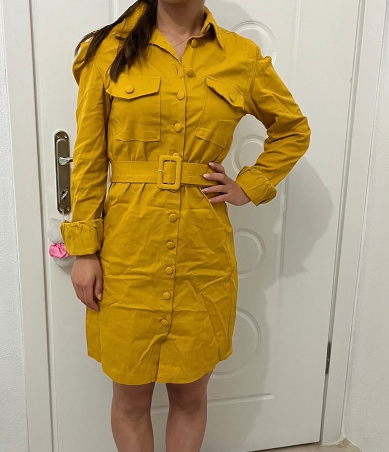 Sarı renkte, kemerli ve düğmeli midi uzunlukta kadın elbisesi. Uzun kollu, rahat sokak stili için uygundur.