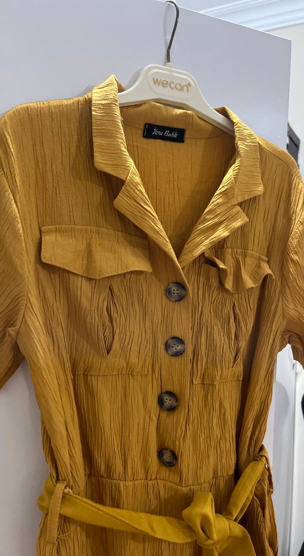 Sarı, midi boy, kısa kollu, yakalı, kemerli, bol kesim keten kumaş rahat kadın elbisesi. Günlük kullanım için uygundur.