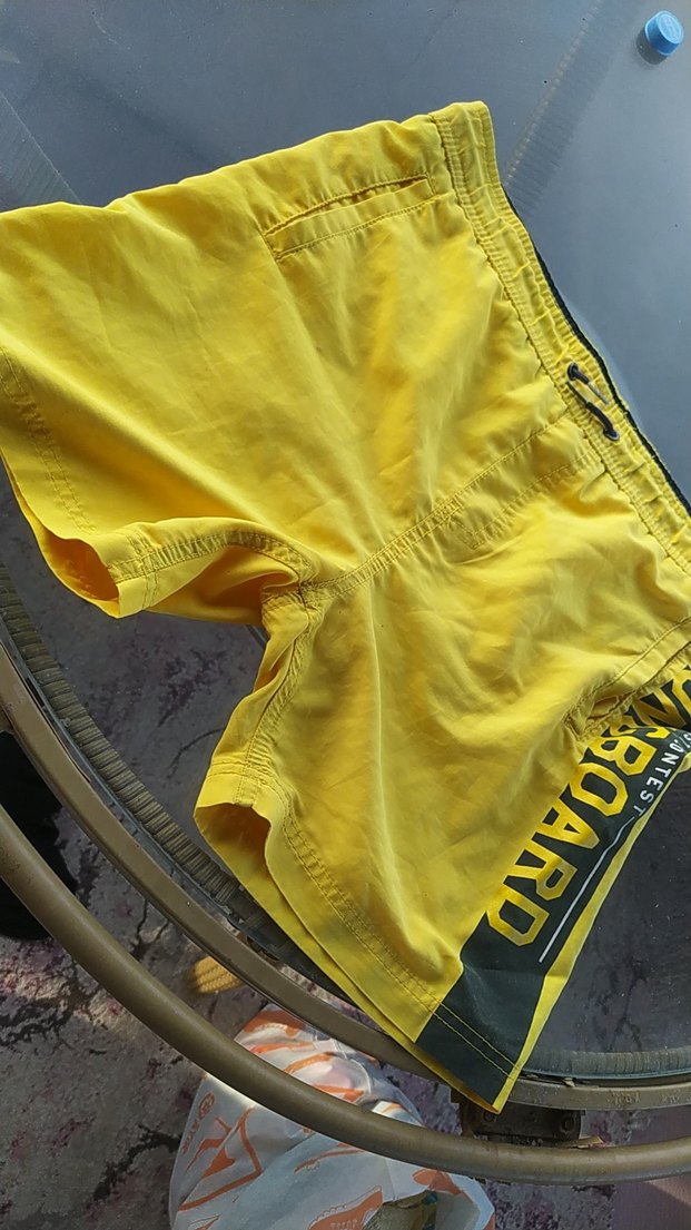 Kemerli ve parlak sarı renkte, bol kesim mini erkek deniz şortu. Yanında "BOARD" yazısı bulunan sade tasarımlı, plaj ve sokak stiline uygun şort.