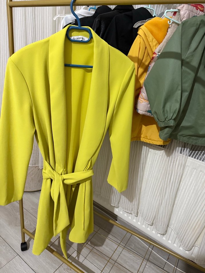 Sarı renkli, kemerli ve kısa kesim kadın blazer. Minimalist tarzda, ince askılı ve regular fit. Günlük kullanıma uygun, sentetik kumaştan üretilmiştir.