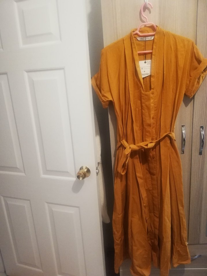 Kemerli bel, V yakalı, kısa kollu ve bol kesimli uzun sarı keten elbise, minimal ve bohem tarzda.