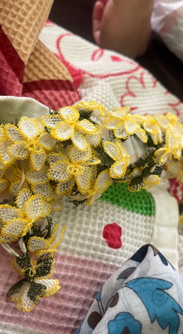 Sarı kenar işlemeli, çiçek desenli bohem dantel, el emeği görünümü katar. Yazmaya dikilebilir toplam 40 Çiçek el emeği ceyızlık olabılır