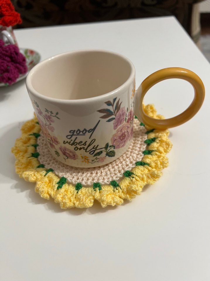 Sarı Kenarlı El Örgüsü Bardak Altlığı ve Fincan.